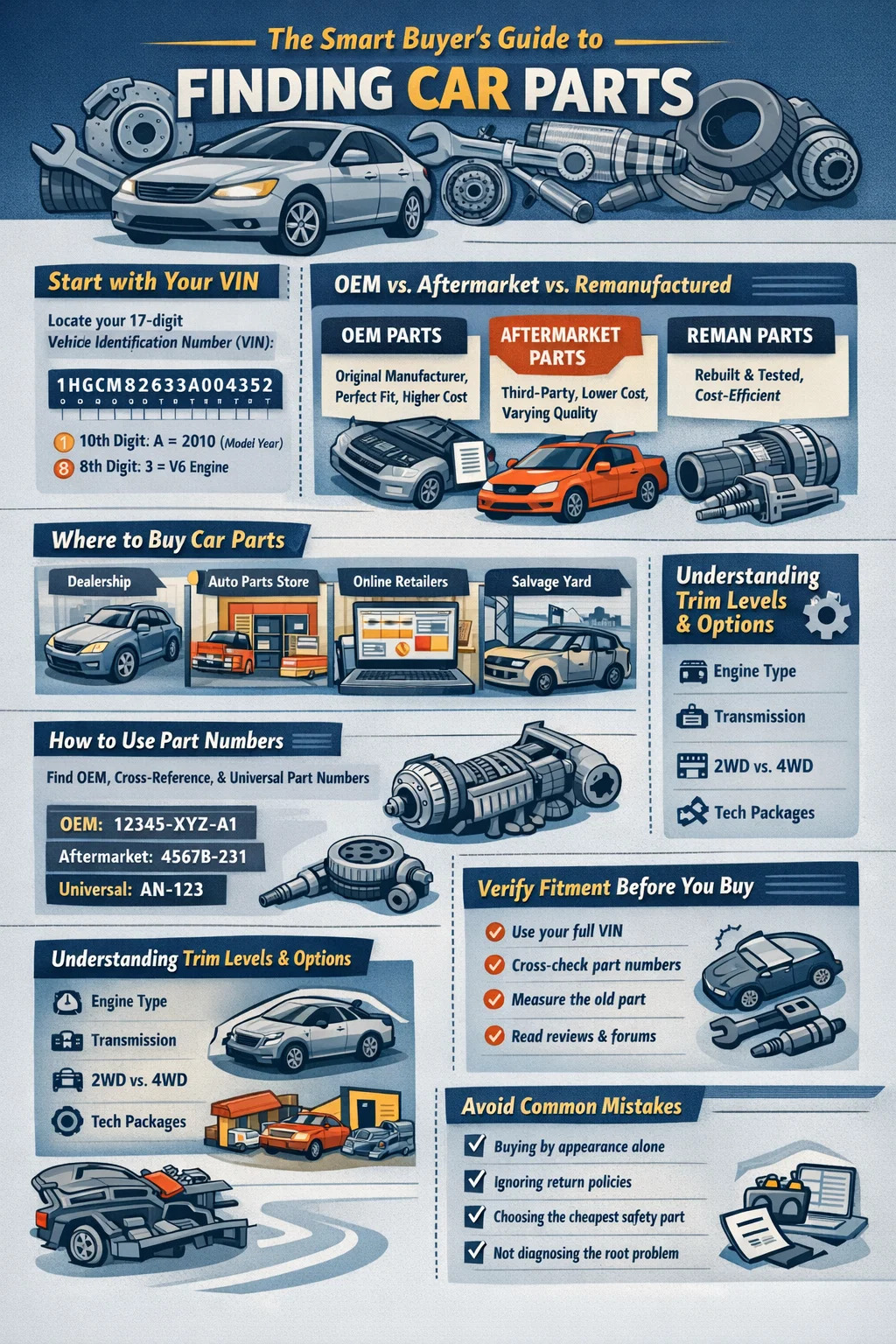 자동차에 적합한 부품을 찾는 것은 협상할 수 없는 하나의 출발점으로 귀결됩니다. 차량을 검색하기 전에 차량의 연도, 제조사, 모델, 엔진 크기 및 트림 수준을 알아야 합니다. 자동차 부품 . 이 정보가 없으면 동일해 보이는 부품이라도 제대로 작동하지 않거나 제대로 작동하지 않을 수 있습니다. 이러한 세부 정보를 잠그면 대리점, 온라인 소매업체, 폐품 처리장 또는 자동차 부품 매장에서 구매하는 등 프로세스가 훨씬 더 간단해집니다. 이 가이드는 해당 프로세스의 모든 단계를 실용적인 세부 사항과 함께 안내합니다.