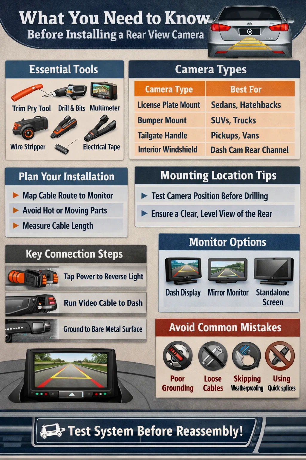 자동차 후방 카메라 설치는 대부분의 차량 소유자가 완료할 수 있는 간단한 DIY 프로젝트입니다. 1~2시간 기본 도구로. 핵심 프로세스에는 차량 후면에 카메라를 장착하고, 전원 및 비디오 케이블을 내부로 라우팅하고, 모든 것을 디스플레이 모니터에 연결하는 작업이 포함됩니다. 세단, SUV, 픽업트럭, 해치백 등 어떤 차종에서 작업하든 기본 단계는 일관되게 유지됩니다. 단, 케이블 배선 거리와 장착 문제는 차량 유형에 따라 다릅니다.