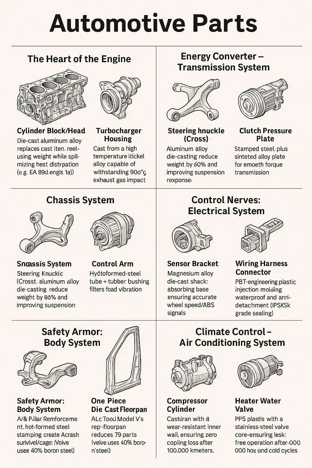 자동차 부품 차량을 구성하는 수백 개의 기능 단위로 구성되며 6가지 핵심 시스템으로 분류됩니다.