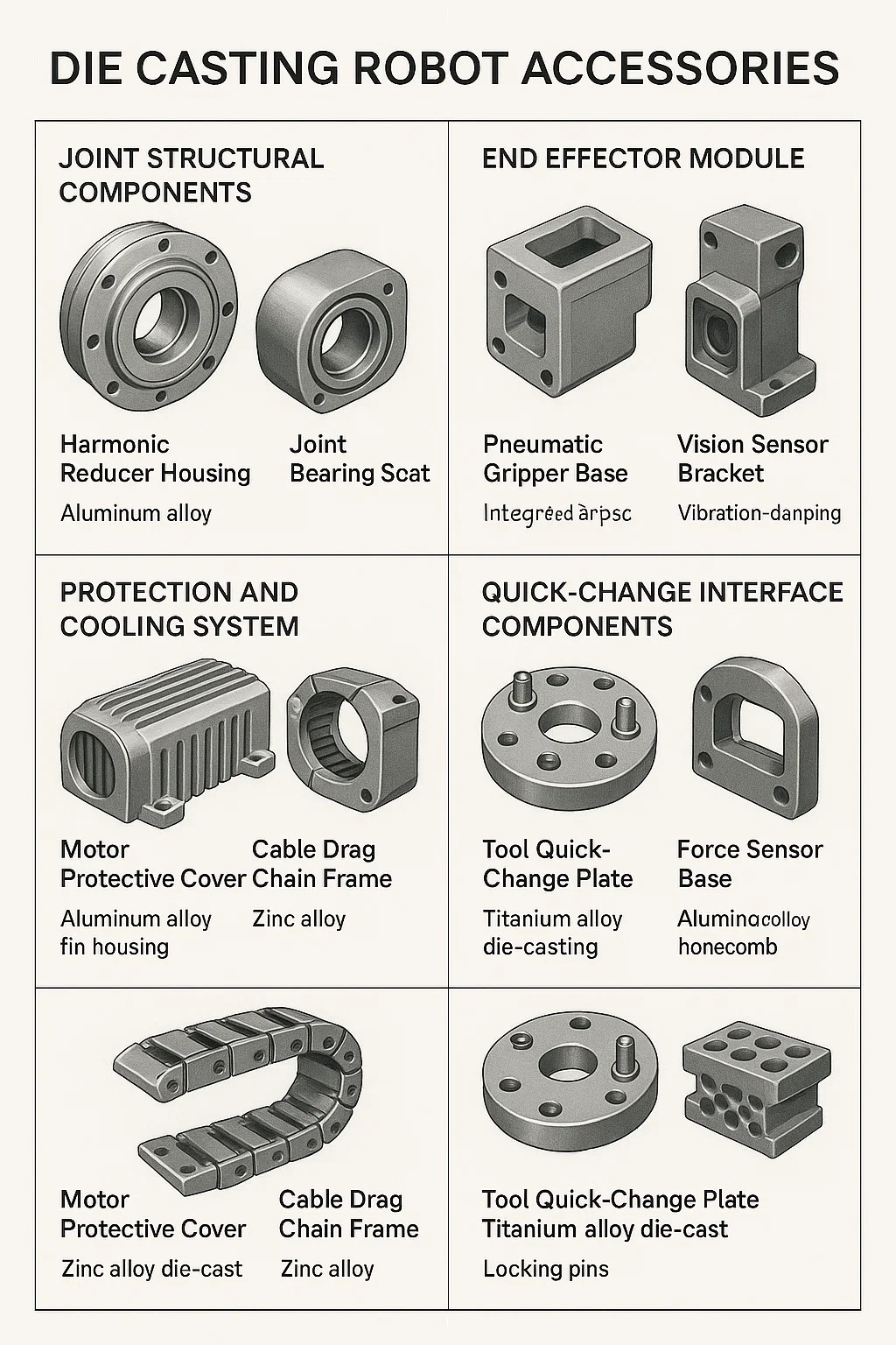 다이캐스팅 로봇 액세서리 고압 주조 공정을 통해 제조된 핵심 금속 부품입니다. 정밀도, 경량화, 내구성 등 산업용 로봇의 핵심 요구 사항을 해결합니다. 주요 응용 프로그램 및 기능은 다음과 같습니다.