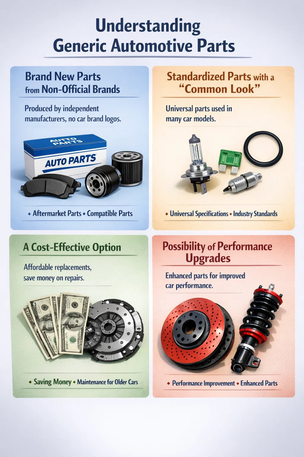 "일반 부품" 또는 "브랜드 대체 부품"은 우리가 일반적으로 부르는 것입니다. 자동차 부품 자동차 제조사에서 직접 제작하지는 않지만 차량에 완벽하게 장착이 가능한 제품입니다. 제약 업계의 '제네릭 의약품' 또는 휴대전화의 '제3자 액세서리'라고 생각할 수 있습니다.