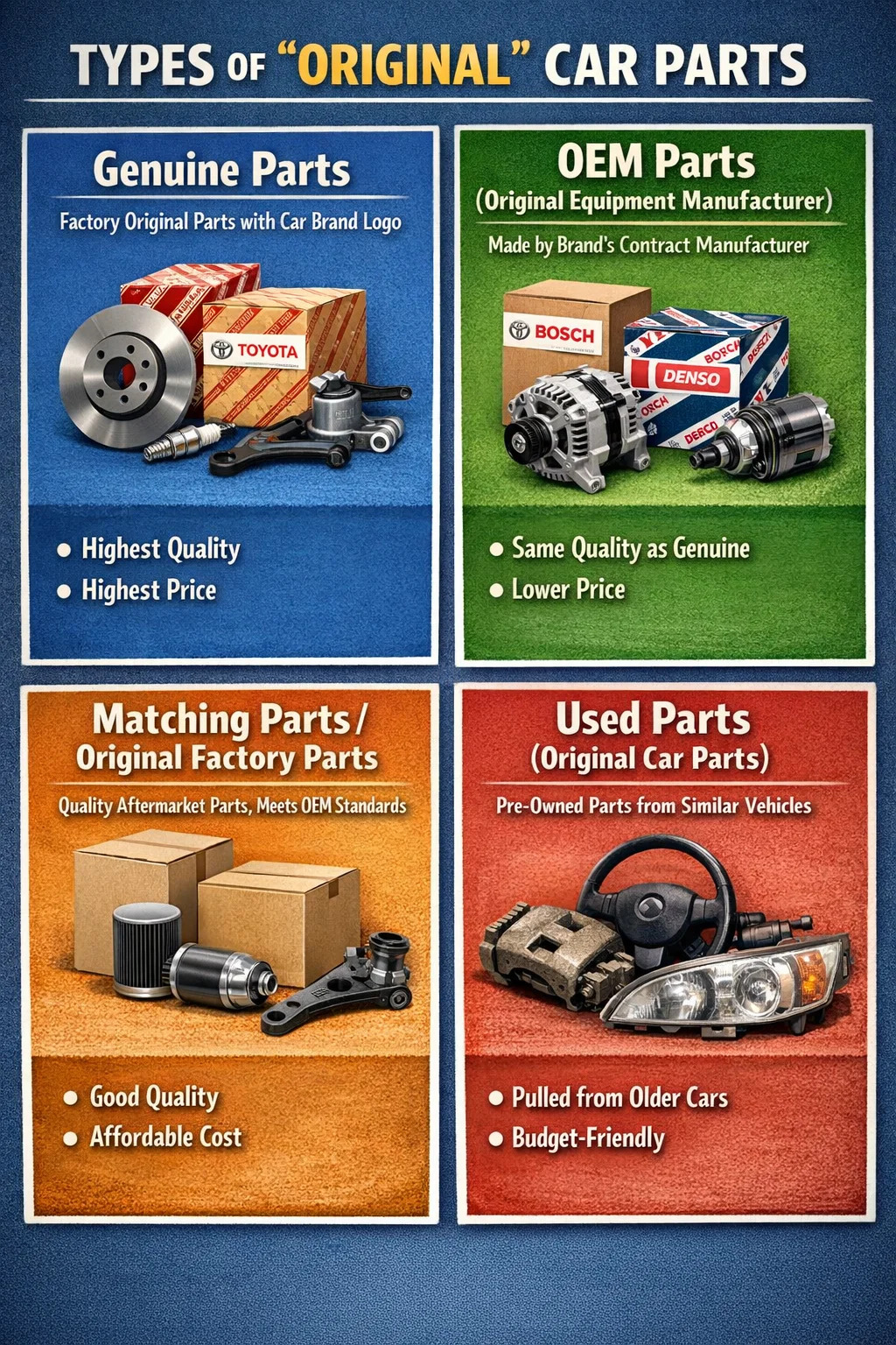 간편 설명: 우리는 순정 부품을 찾고 있지만 가끔 시장에서 구형 자동차에서 제거된 부품을 "순정 자동차 부품"이라고 부르기도 합니다. 이러한 자동차 부품은 원래 제조 업체에서 제조되었지만 더 이상 새 부품이 아니라 중고 부품입니다.