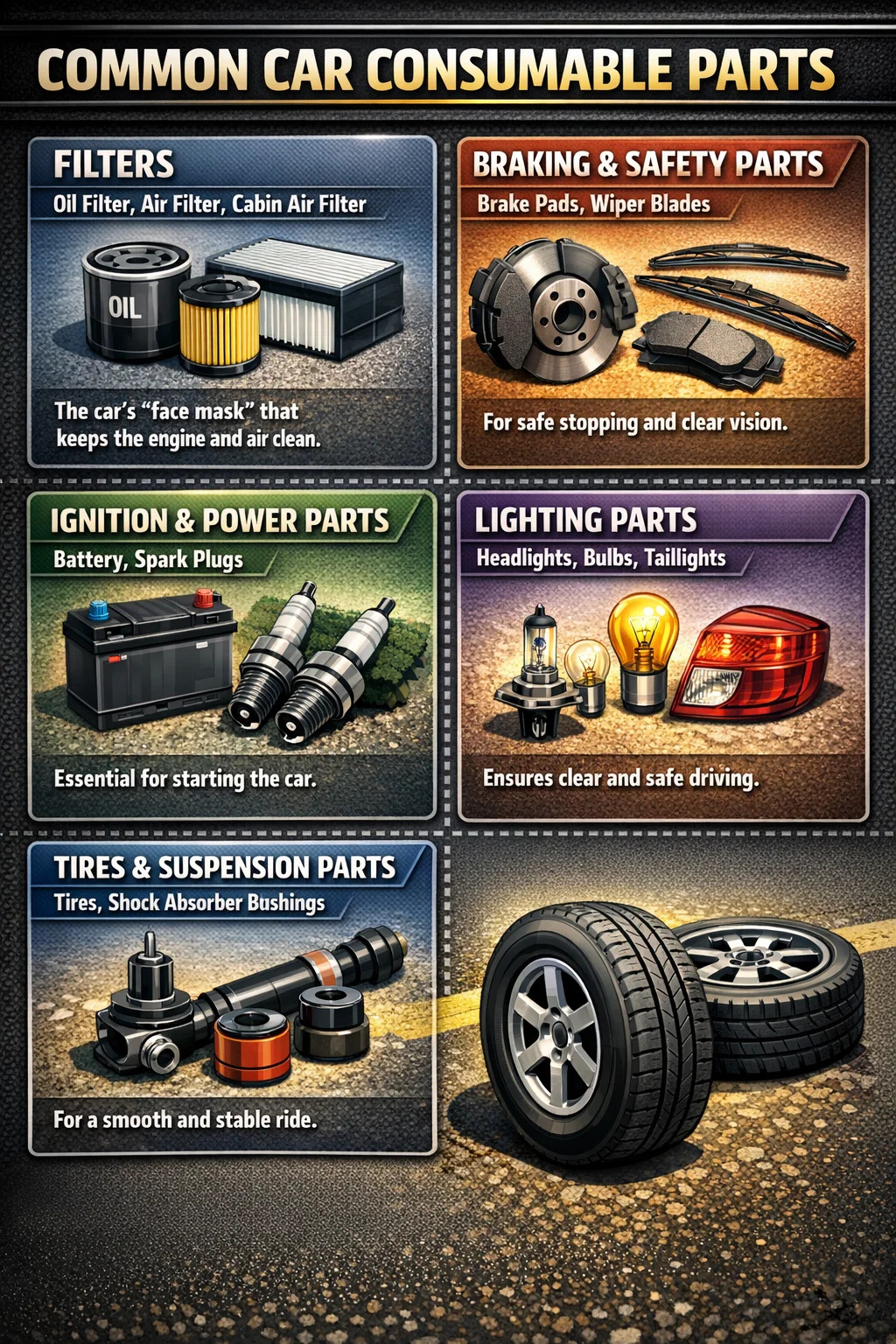 자동차 세계에서 일부 부품은 빨리 마모되고 수요가 많아 자동차 부품 매장이나 수리점에서 쉽게 구입할 수 있습니다. 이러한 자동차 부품을 일반적으로 "소모성 부품" 또는 "일반적으로 사용되는 부품"이라고 합니다.