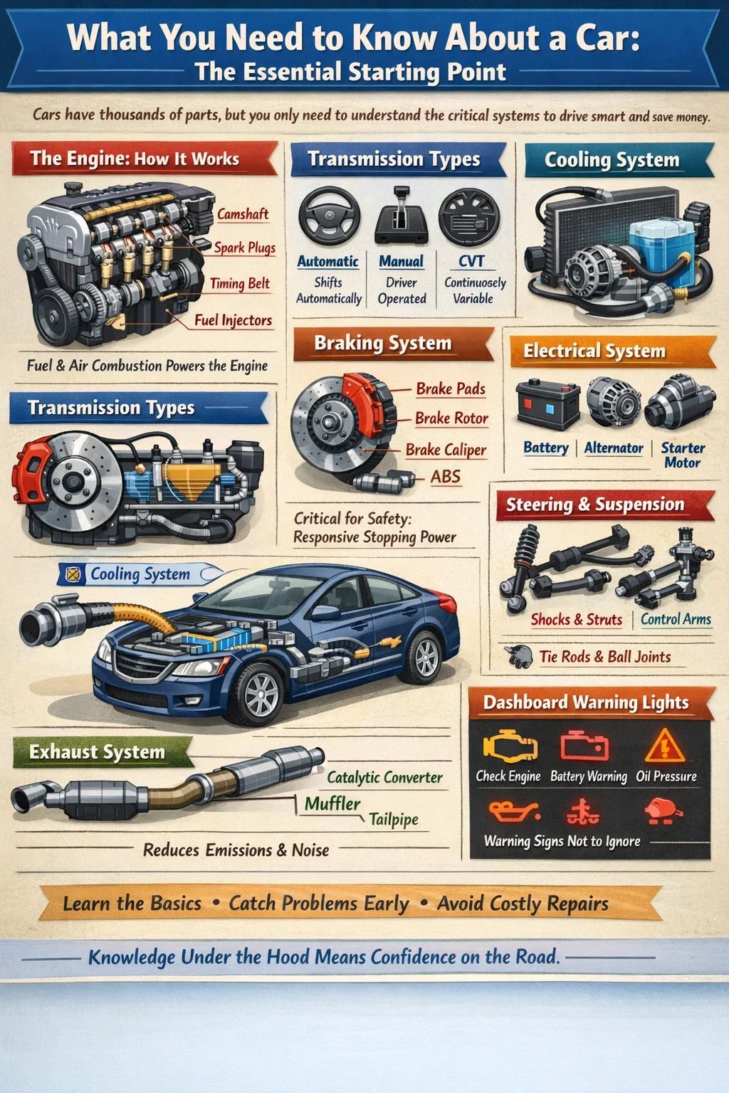 도로 위의 모든 자동차는 상호 연결된 시스템의 집합체이며 이를 이해하기 위해 정비공이 될 필요는 없습니다. 일반적인 차량에는 대략 30,000개의 개별 부품이 포함되어 있습니다. 그러나 대부분의 자동차 소유자는 안전을 유지하고, 비용을 절약하고, 수리점에서 정보에 근거한 결정을 내리기 위해 그 중 일부만 이해하면 됩니다. 이 가이드는 보닛 아래에 있는 것부터 부드러운 승차감을 유지하고 브레이크의 반응성을 유지하는 것까지 일상적인 운전자에게 실제로 중요한 자동차 부품과 시스템을 안내합니다.